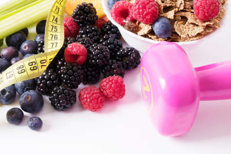 Healthy lifestyle and nutrition eating concept. Food with sports fitness equipment