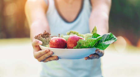 Teenage girls holding a plate with fruits, vegetables, eat healthy
