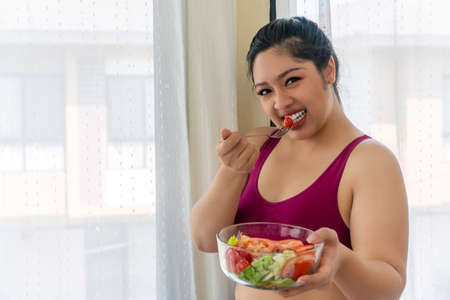Healthy food. Women plan dieting for slim shape and healthy. Woman eating vegetables, salad and tomatoes