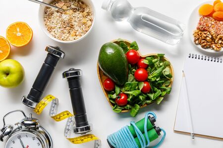 top view of sport equipment, measuring tape, alarm clock and notebook near diet food and water on white background