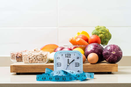 Still life with a clock, a tape measure and healthy food. Conceptual image of intermittent fasting, a diet with benefits such as the regenerative mechanism of autophagy.