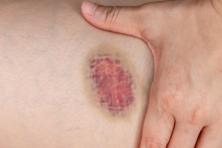 Close-up of woman's hand with bruise on her leg