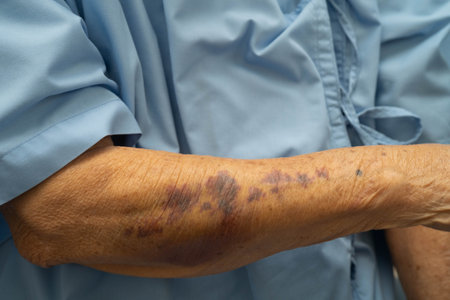 Senior woman arm with a bruise hematoma or haematome on skin, medicine and healthcare