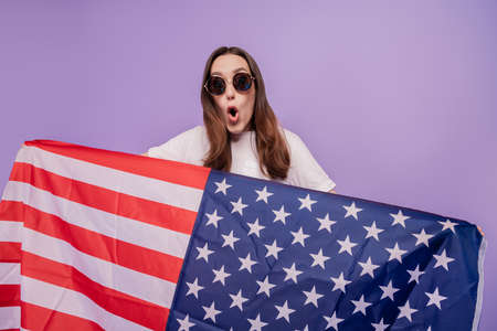 Young woman holding american USA flag. Independence Day or traveling in America concept.