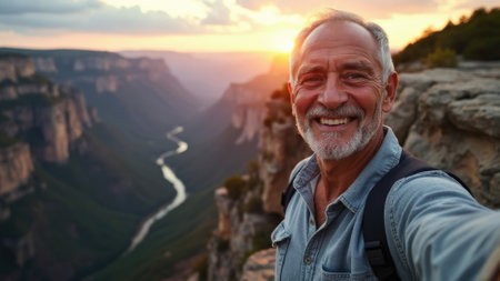 A senior man cheerfully enjoys the sunset while taking a selfie against a breathtaking canyon view, depicting joy, adventure, and embracing the beauty of nature in a serene, golden hour.