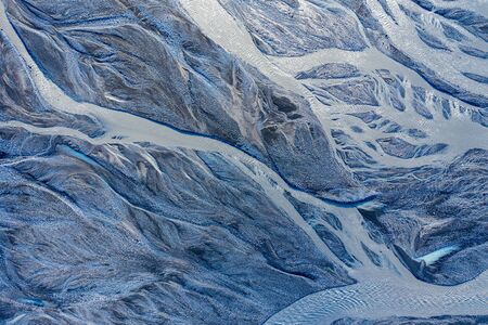 Aerial drone view of a huge riverbed, melting glacier, Iceland. Global warming and climate change concept