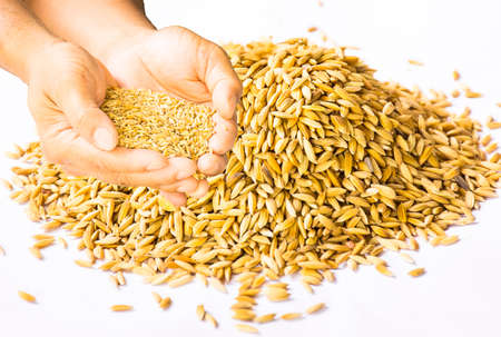 Paddy in hand and paddy isolated on white background.Raw food or Rice has not yet been processed.