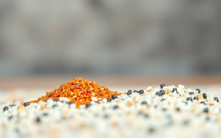 Stunning close-up image showcasing seeds falling onto a pile against a sparkling bokeh background, illustrating textures and vibrant colors in nature and agriculture.