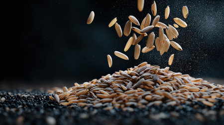 This captivating image showcases golden grains scattering downward, creating dynamic movement against a dark backdrop. Perfect for culinary themes.