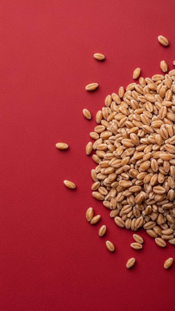 Wheat grains on red background, top view, copy space.