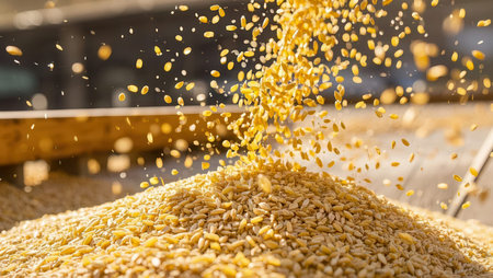 Close-up of golden grain falling and scattering in sunlight with a bokeh effect.