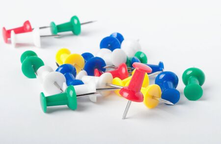 Colorful pushpins on white. Colored pushpins. Office accessories. Office supplies on white.