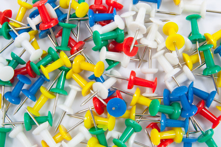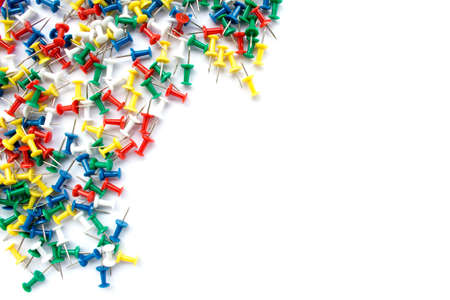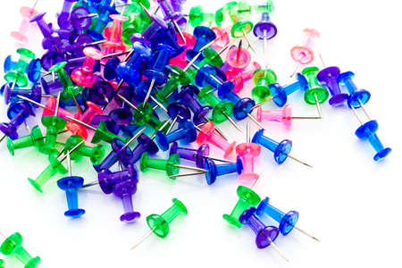Close up of various pushpins on white background