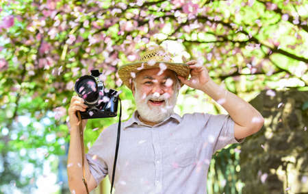 Enjoying free time. Travel and tourism. Capturing beauty. Happy grandfather. Senior man hold professional camera. Retirement travel. Spring holidays. Travel photo. Photographer in blooming garden