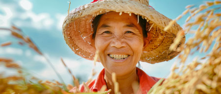 A lively scene depicting joyful farmers in a rural setting celebrating a successful rice harvest. Their hands are filled with fresh grains, showcasing their hard work and dedication. The image captures the essence of community spirit, agricultural tradition, and the beauty of nature.