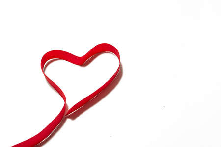 Heart made of red ribbon. Placed on white paper background.