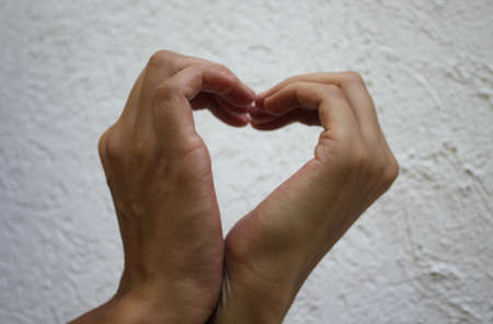Heart symbol, Heart made by hands with blurry white sky background.Closeup.