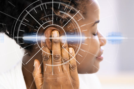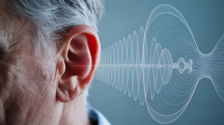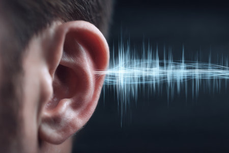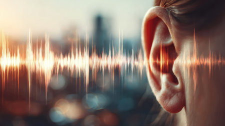 A close-up captures a human ear, highlighted by a glowing sound wave graphic. The image presents a blend of soft focus and sharp detail. Warm, golden tones illuminate the scene, suggesting a digital or conceptual artwork appropriate for educational and commercial applications.