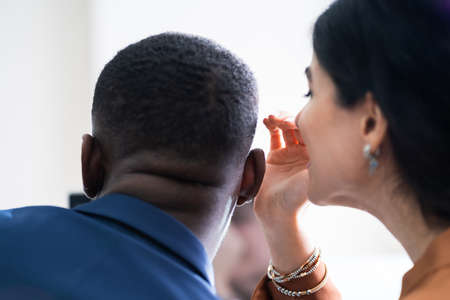 Close-up Of Young Businesswoman Whispering Into Male Partner's Ear