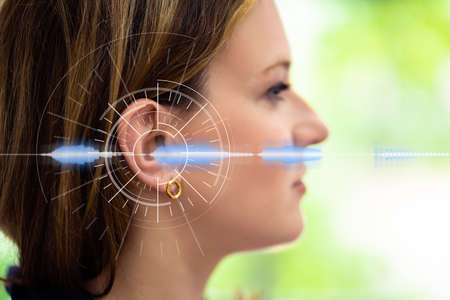 A close-up showcases a human ear alongside a visualization of sound waves. The image features a blurred background and a composition of lines and light. It suggests concepts related to listening, hearing, and audio. This image is suitable for various commercial and editorial applications.