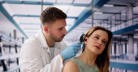 Otolaryngology Ear Check Using Otoscope. Doctor Examining Patient