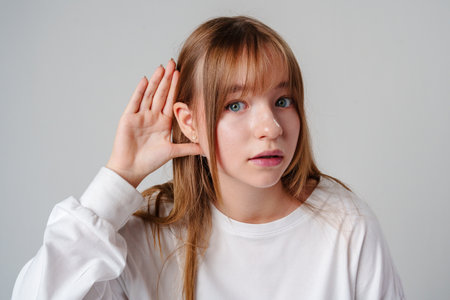 Teen girl with straight hair demonstrates listening pose against a plain background