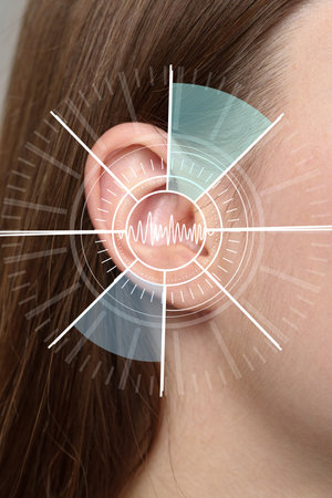 This image features a detailed illustration of a human ear, enhanced with graphical elements suggesting sound waves and audio processing. The composition utilizes a soft color palette and a blend of anatomical realism with conceptual design. Suitable for educational materials, scientific publications, or conceptual presentations on hearing and audio.