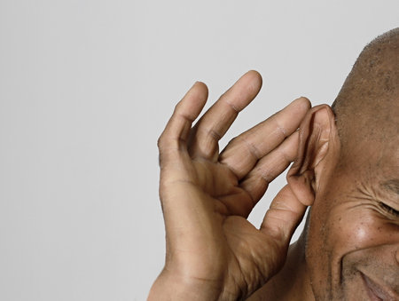 man hearing loss or hard of hearing and cupping his hand behind his ear isolate grey background, Deaf concept.