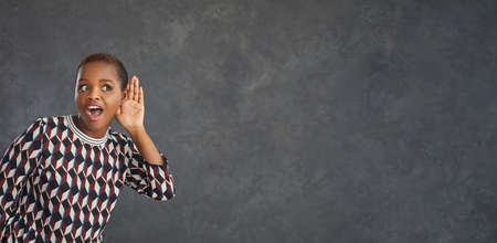 Young funny and inquisitive dark-skinned woman on a gray background overhears a conversation. Woman with a funny expression is trying to hear something standing near a free space for text. Banner.