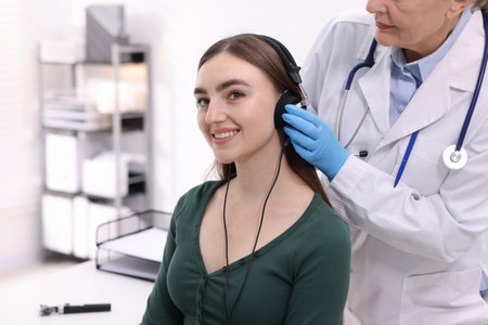 Hearing test. Doctor adjusting patient's audiometric headphones in clinic, selective focus