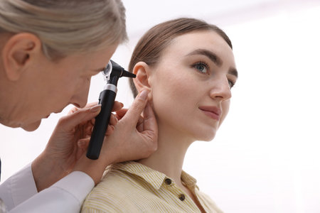 Hearing test. Doctor examining patient's ear with otoscope in clinic, low angle view