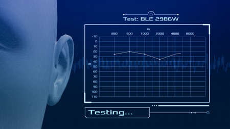 Mature man with hearing aid in the background, sound wave simulation technology. Closing