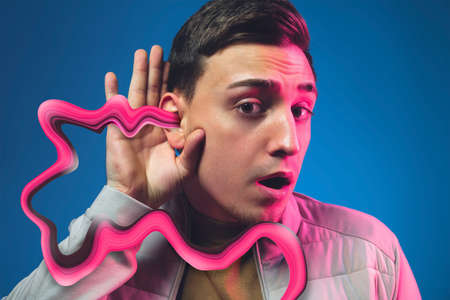 Hearing aid concept, a young man with hearing problems.