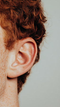 Redhead mans ear is examined closely, highlighting potential hearing problems and emphasizing the importance of ear care and seeking medical attention for hearing loss