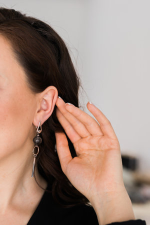 woman hand in ear on gray background