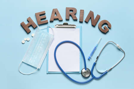 Word HEARING with clipboard, mask and stethoscope on color background