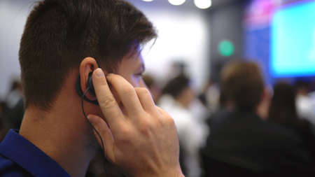 Audience business meeting crowded forum person. Viewer seminar listen earphone speaker auditorium. Event political summit business man spectator. Group people listening translate speech crowd audience