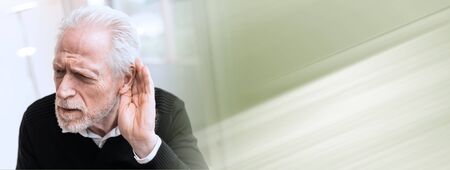 Portrait of senior man having hearing problems; panoramic banner