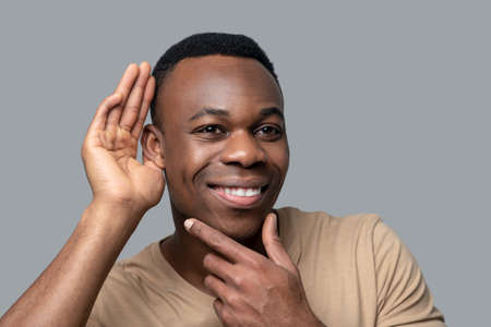A casual man in casual t-shirt hold his hand on ear trying to listening carefully to the conversation of someone.