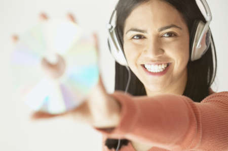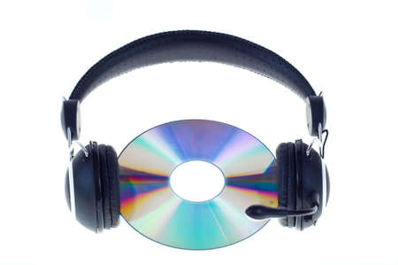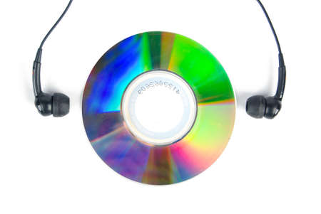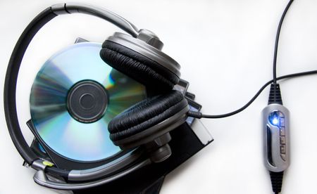 White headphones and CD player with a colorful disc on a minimalist white background.