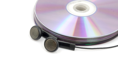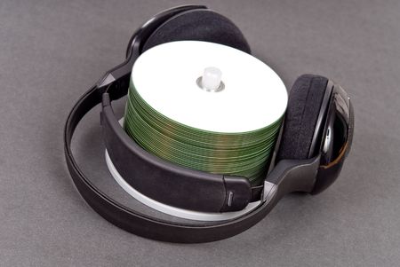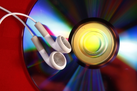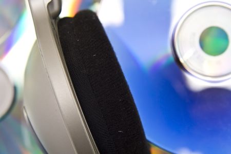 Black audio headphones on a pile of glossy compact discs with colored reflections
