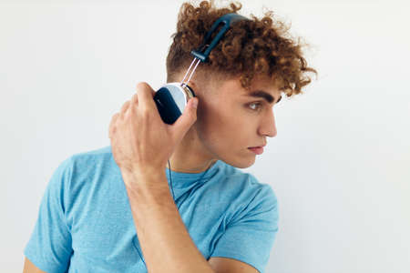 Man with headphones in hands music emotion technology lifestyle fun blue background close-up