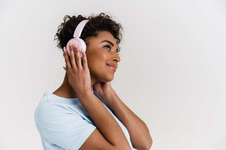 Smiling black woman in t-shirt listening music with headphones isolated over white background