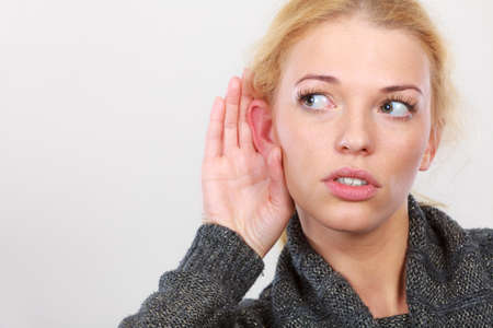 Gestures, gossip and rumors, hearing loss or disorder. Woman put hand to ear for better hear. Studio shot on light grey backgroung