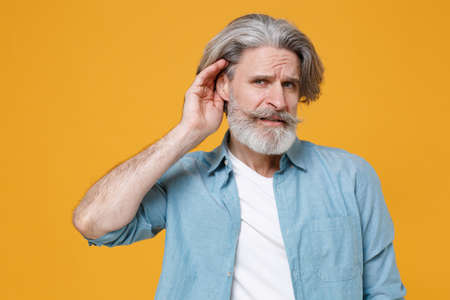 Curious elderly gray-haired mustache bearded man in casual blue shirt posing isolated on yellow background in studio.