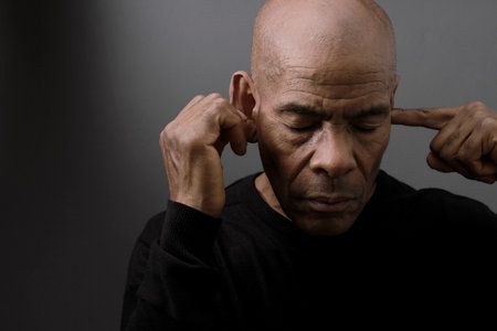 deaf man suffering from deafness and hearing loss on grey black background with people stock image stock photo