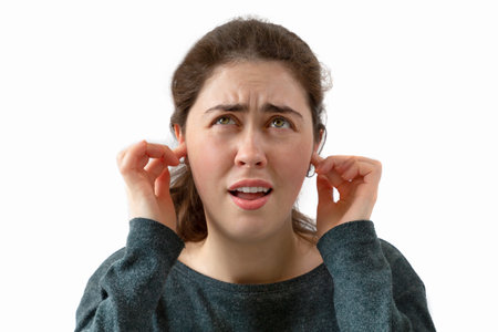 Girl in her mid 20's covering ears, suffering from loud noise, unhappy female feeling pain