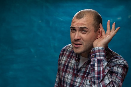 Caucasian man hold hand near ear. Trying to hear a gossip