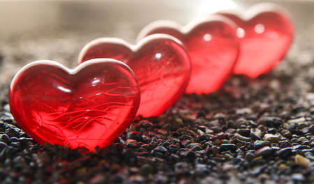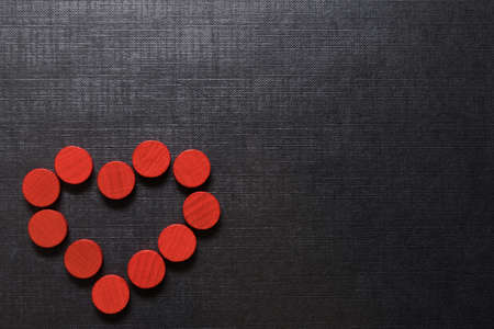 Top view of red and white wooden handcraft heart symbol on black background. Dark,elegance and luxury backdrop. Valentine's day theme.
