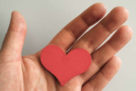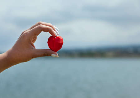 Red heart in the palm of your hand against the backdrop of the reflections of the sea. selective focus.